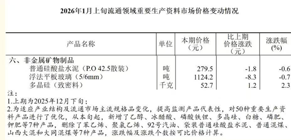 今年起,国家统计局50种重要监测产品中浮法平板玻璃规格由4.8/5mm变更为5/6mm 国家统计局1月14日发布1月上旬全国流通领域9大类50种重要生产资料市场价格监测情况,2026年1月上旬与2025年12月下旬相比,27种产品价格上涨,20种下降,3种持平。 与去年相比,今年国家统计局监测的产品类别有所变化:第六类“非金属建材”变更为“非金属矿物制品”,统计的浮法平板玻璃规格由4.8/5mm变更为5/6mm。 上一篇:总投资107亿元,年产50万吨高性能连续玄武岩纤维项目落地协议签署 下一篇:近二年玻璃日熔量与平板产量